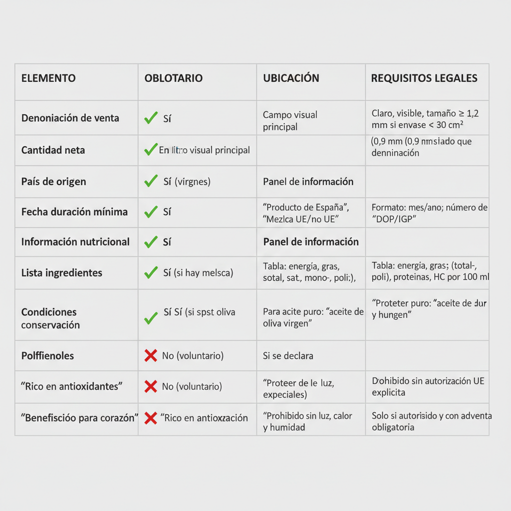 En cuanto a la información voluntaria, son frecuentes menciones relativas a propiedades saludables o a la presencia de polifenoles, para las que resulta imprescindible atenerse a la normativa sobre declaraciones nutricionales y de propiedades saludables, evitando afirmaciones no autorizadas o que atribuyan al “aceite de oliva virgen extra” efectos preventivos o curativos de enfermedades. El incumplimiento de estos límites puede suponer una infracción específica en materia de declaraciones de salud, además de un indicio de posible fraude alimentario si las alegaciones se utilizan para justificar precios o posicionamientos de mercado no respaldados por el producto real.